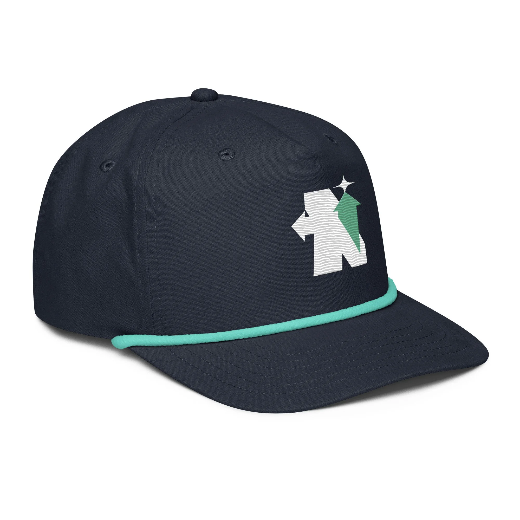 NEMS N STAR Grpahic on a Classic style golf rope hat. Featuring a structured fit, rope detail, and adjustable snapback. Direct Embroidery. Mint Visor Rope and back closure.